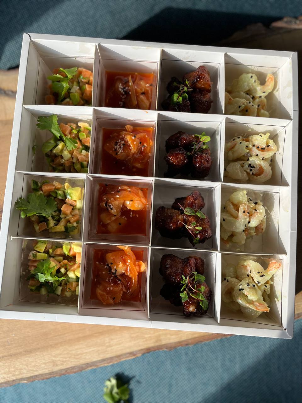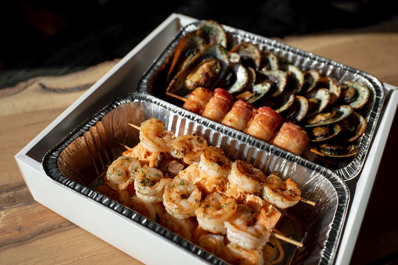 Пикник на 4х из морепродуктов 10000р, также возможно заказать ланч боксы из меню.