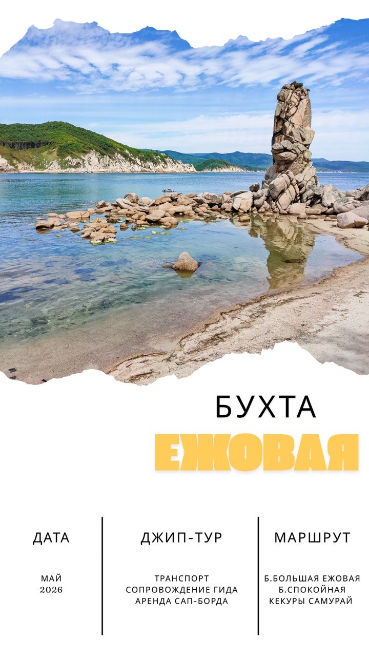 Что вас ждёт: — Бухта Большая Ежовая и бухта Спокойная — Кекур «Самурай» и живописные видовые площадки — Заброска на внедорожнике максимально близко к пляжу — Свободное время для отдыха и прогулок — Живые эмоции, красивые фото и смена обстановки